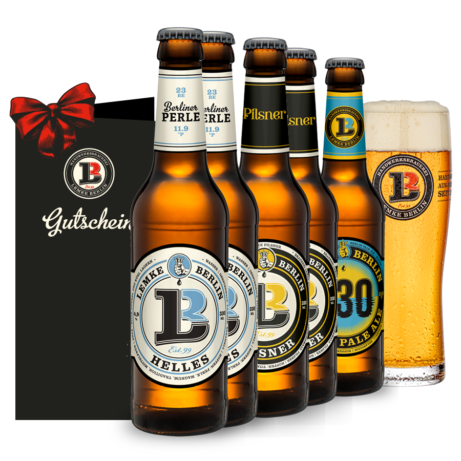 Mit diesem Set kommt ein schöner Bier-Mix zu dir (oder an die Adresse deiner Wahl innerhalb Deutschlands), den du gleich mit dem passenden Glas verkosten kannst. Und dann geht es für die zweite Runde ab nach Berlin: Mit dem Gutschein buchst du dir einen Platz in einer unserer Touren durch die Brauerei. Schau dir an, wo und wie wir brauen - und klar, im Anschluss verkosten wir auch ein paar Lemke-Biere!